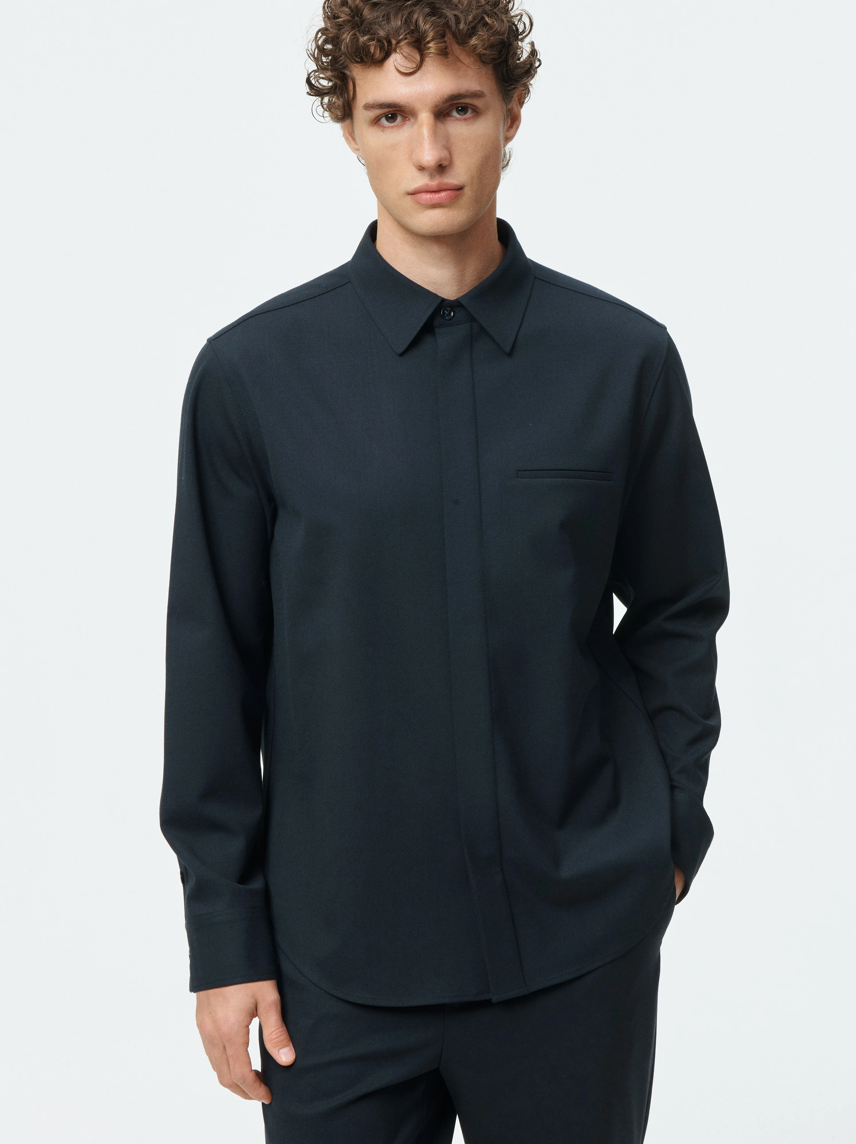 Made in New York, the WOOL STRETCH SHIRT is crafted from a midweight Italian stretch wool-nylon, designed for ease and movement. Its relaxed silhouette features a concealed placket and a curved hem that flows naturally with the body. Worn untucked or open over a tee or mock neck, it embodies quiet versatility - a piece that adapts effortlessly, moving in harmony with life’s rhythms.
